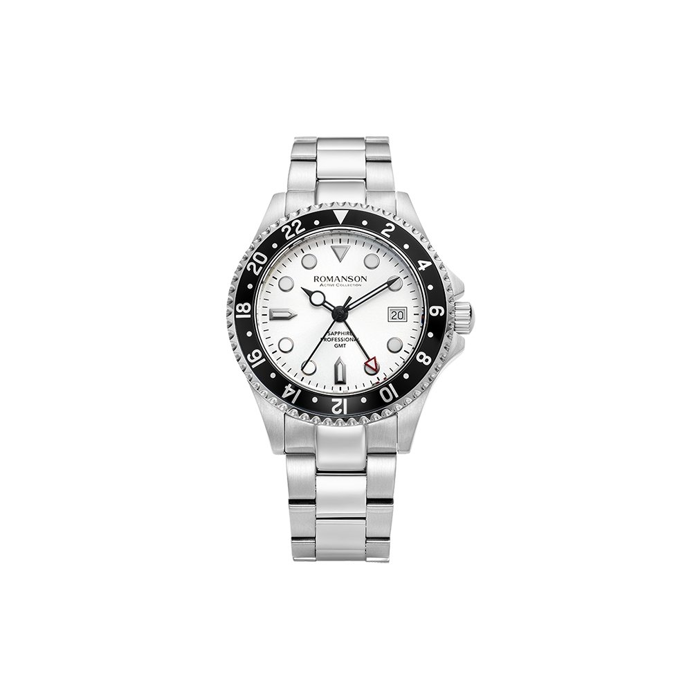 The Romanson AM0004FMWWH White Dial GMT Men’s Watch combines sophistication with performance. Designed with a 41mm stainless steel case, a striking white dial with black GMT bezel, and sapphire crystal glass,