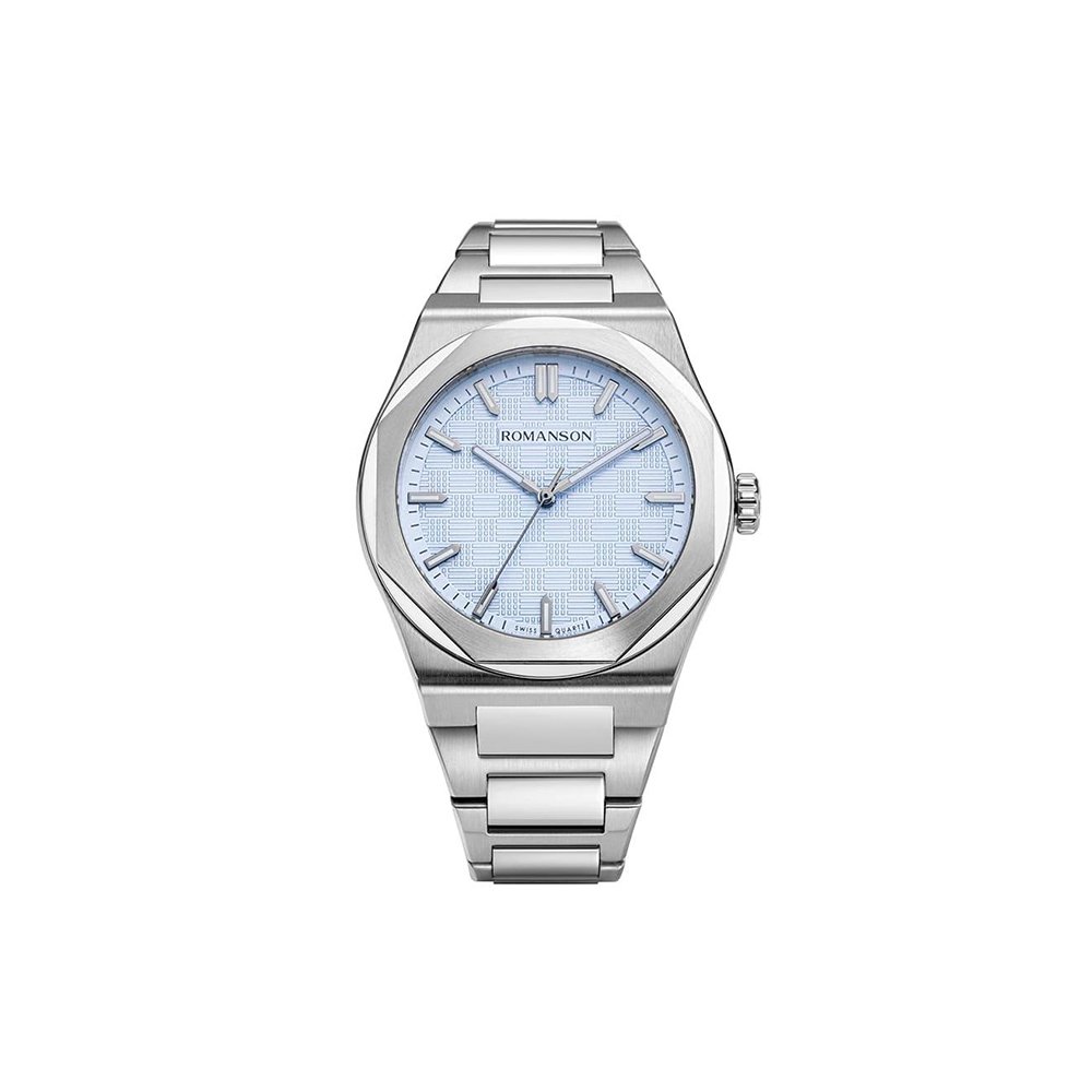 The Romanson RM4BS004MWLBU Men’s Watch combines bold design with modern sports-luxury style. Its 41 mm geometric stainless steel case and integrated bracelet create a sleek, durable look. The striking ice-blue dial, enhanced with a detailed Tapisserie pattern, adds depth and sophistication.