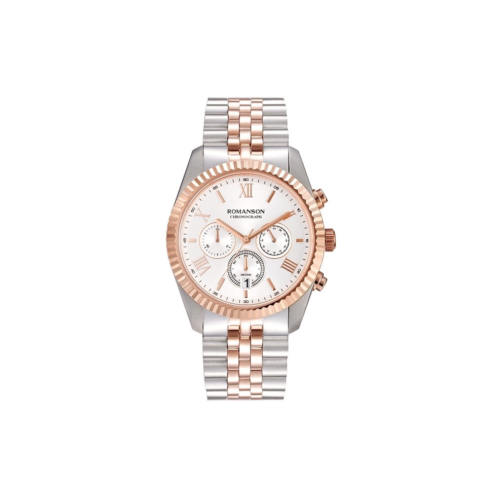 Discover the Romanson TM6A28HMJWH Chronograph Watch – a perfect blend of sport and sophistication. Designed with a 41 mm stainless steel case and a refined fluted bezel, this watch captures timeless elegance. The two-tone rose gold and silver bracelet adds a luxurious touch, making it suitable for both formal and casual wear.