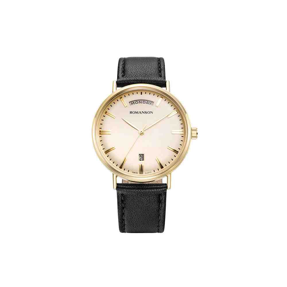 The Romanson TL4BF006MMGGD Men’s Watch captures the essence of timeless style and classic watchmaking. This elegant 40 mm dress watch features a polished gold-tone stainless steel case paired with a refined black leather strap.